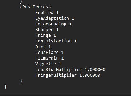 Players can change settings like Film Grain, Vignette, Color Grading, and Sharpen using the config file. Here’s a screenshot from the file: