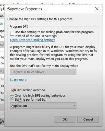 • Tick “Override high DPI scaling behavior” and select “Application” from the drop-down menu