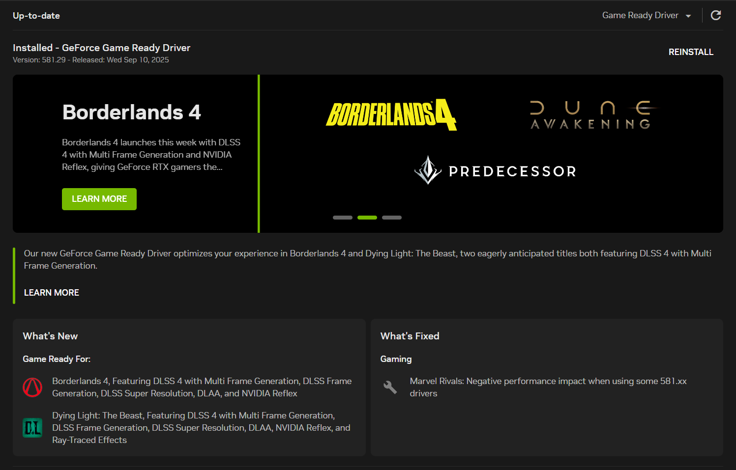 Nvidia has already released a full-fledged update that delivers day-0 optimizations for Borderlands 4. The Driver version is 581.29.