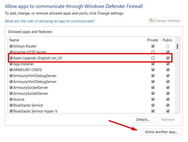 Locate “Destiny 2” and click on both Private and Public checkboxes.