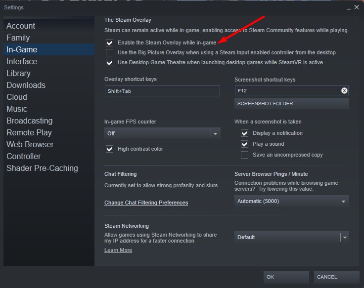 Under “In-Game”, uncheck the box next to “Enable Steam Overlay while In-Game”.