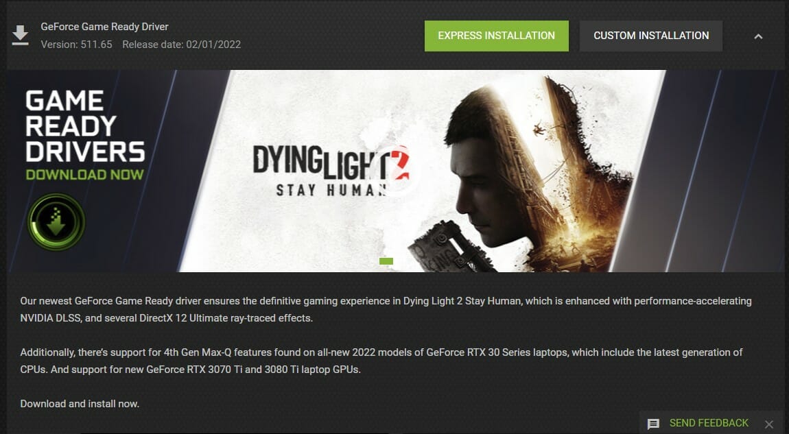 Both Nvidia and AMD have already pushed updates that are optimized for Dying Light 2. The Nvidia update ensures the definitive gaming experience in Dying Light 2 Stay Human, which is enhanced with performance-accelerating NVIDIA DLSS, and several DirectX 12 Ultimate ray-traced effects.