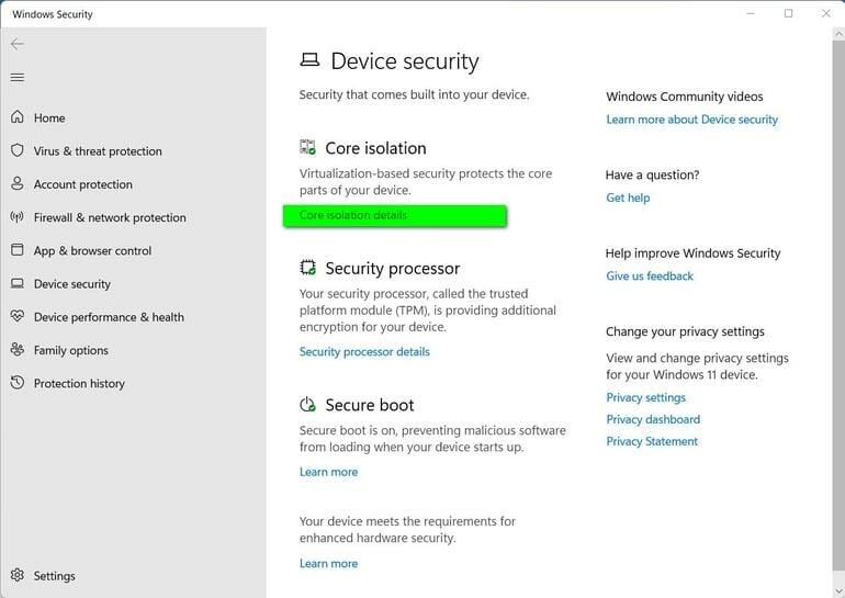 - Click Privacy and Security > Windows Security > Device Security