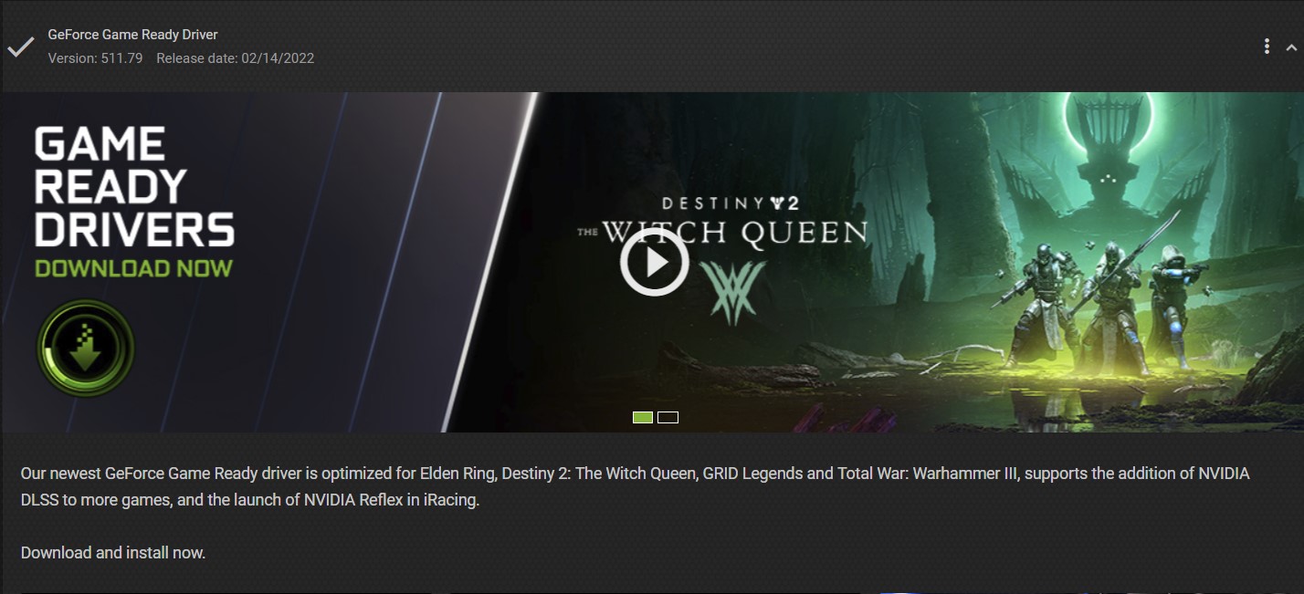 Our newest GeForce Game Ready driver features support for February 2022’s highly anticipated games, Elden Ring, Destiny 2: The Witch Queen, GRID Legends, and Total War: Warhammer III, giving you the definitive experience the second you start playing.