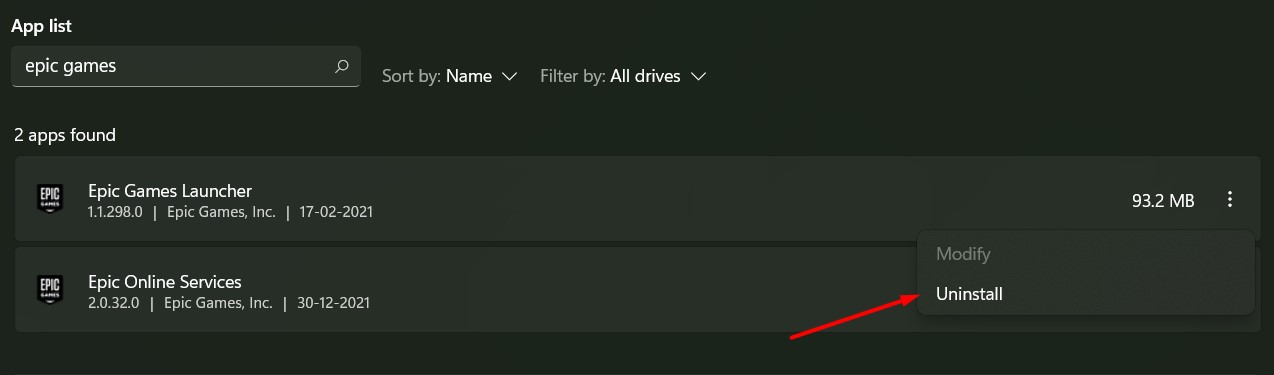 Some users could fix their problem by uninstalling the Epic Games Launcher. You can search for “Add or Remove Programs” in the Windows search. After this, locate the Epic Games Launcher and click the uninstall button as shown below: