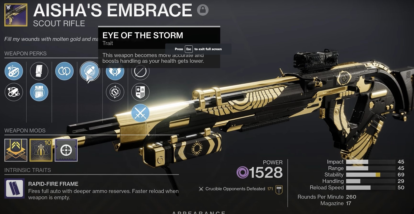 The Aisha’s Embrace Scout Rifle is another new weapon that I have discovered that works great in both PvE and PvP. This is a legendary 260RPM Rapid-Fire Frame Scout that might be one of the best in the game. On top of that, it is Void, and we know the state of the void in this meta.