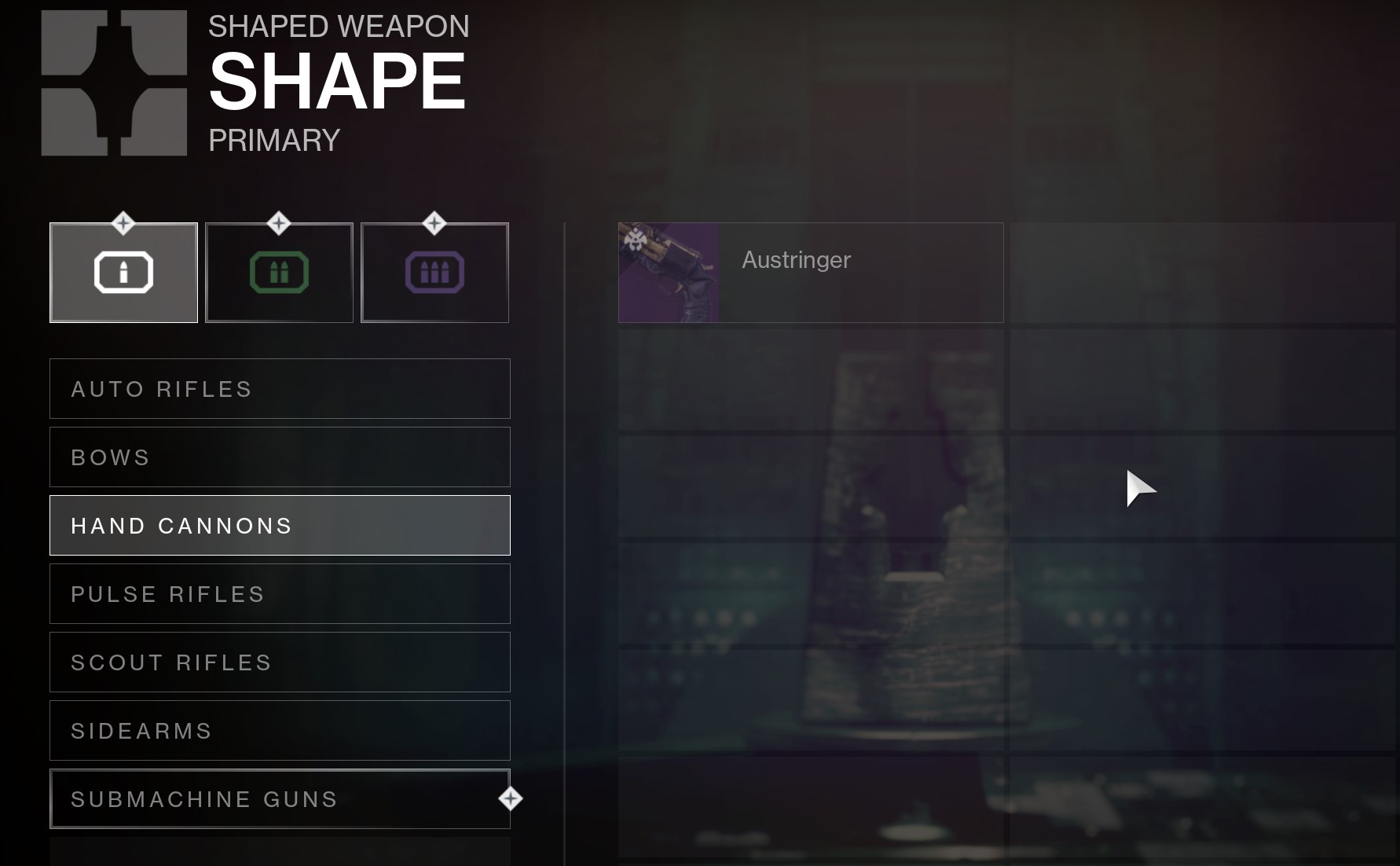 Once that is complete, you have to head to the Enclave on Mars. Access the Relic > Shape > Hand Cannons > Austringer.