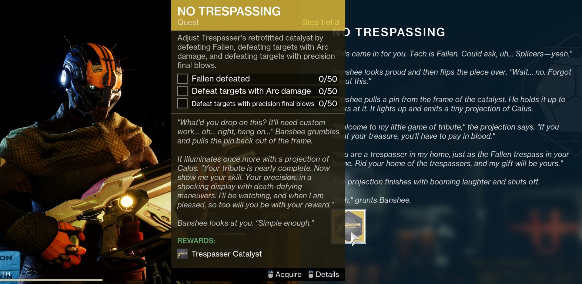 Head to Banshee-44 and let him do his talking. Once he’s finished, he will give you an exotic quest card. Completion of this quest will reward you with Trespasser Exotic Sidearm Catalyst.