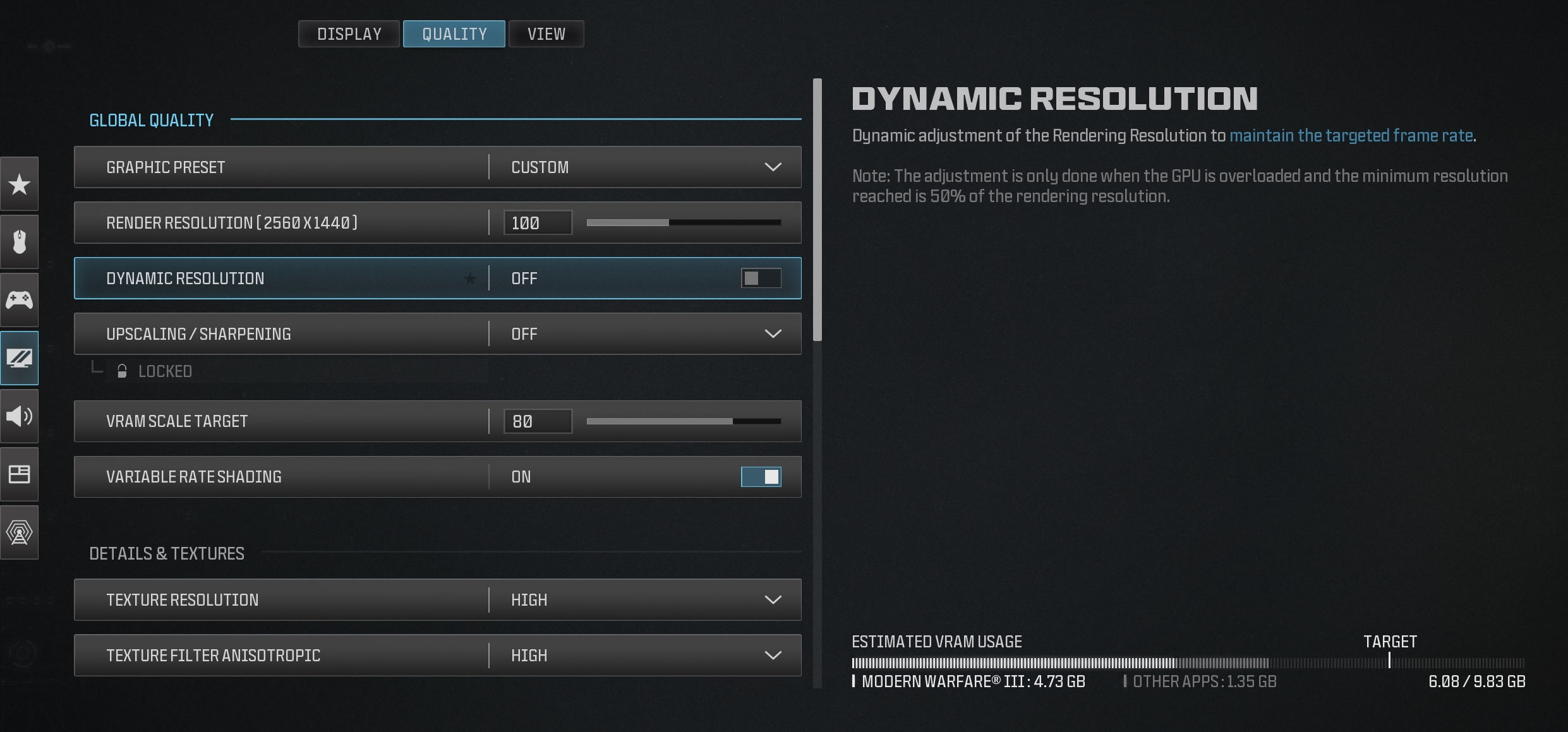 It might make sense to turn on Dynamic Resolution if you have a very old GPU. But this will occasionally make the game look weird, as your textures will be adjusted dynamically.
