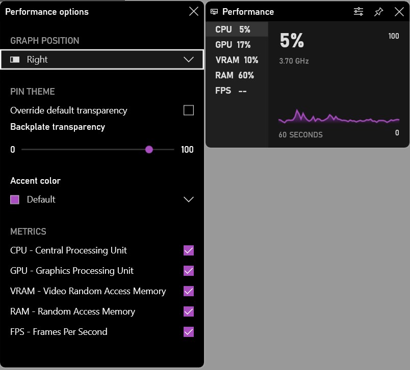 You will find a floating performance window displaying stats such as CPU, GPU, VRAM, RAM, and FPS. Here’s what it looks like: