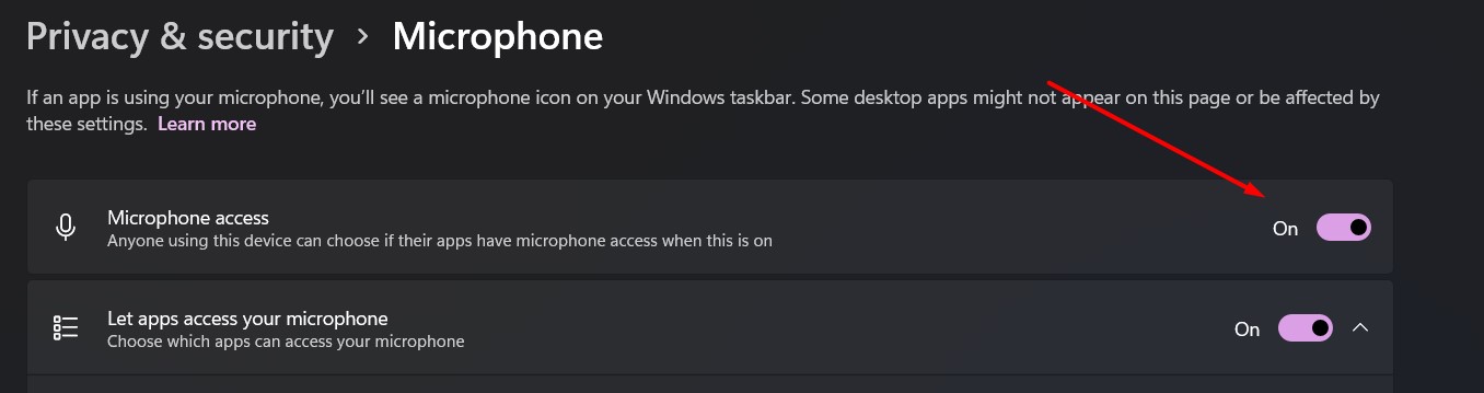 Click on the Microphone Access toggle as shown in the image below: