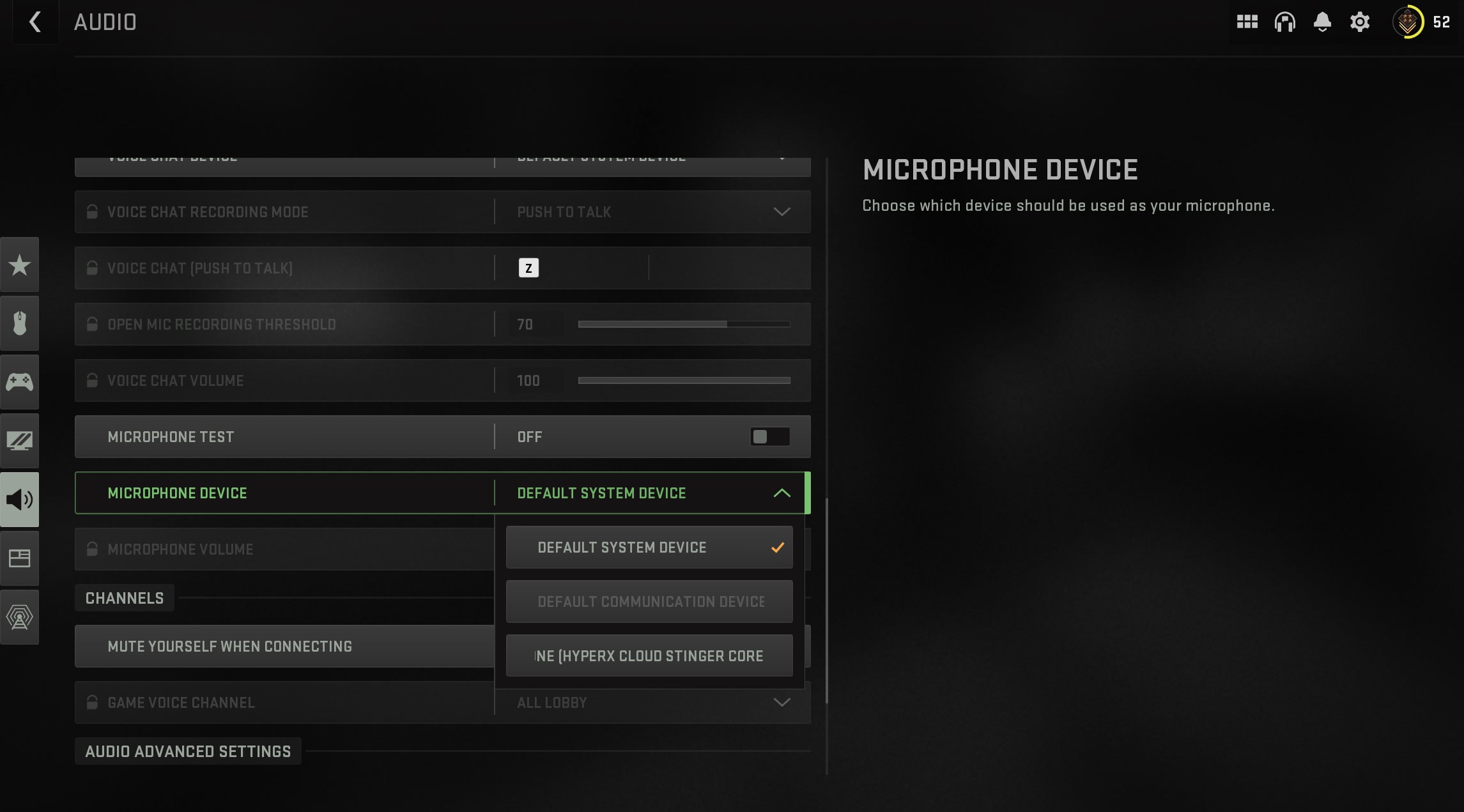 Scroll down to “Voice Chat” and make sure that the correct microphone device is selected, as shown in the image above.